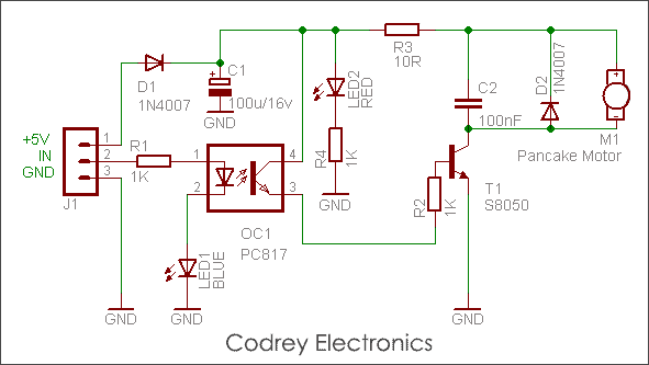 Even though the pancake motor works well with a dc supply of 3V, driving it directly by an I/O of a microcontroller is very unsafe. This is because the pancake motor not only draws current in 75-100mA range (3-5V), but also produces large voltage spikes and noises (harmful to the microcontroller). This is the reason, why you can see the driver transistor (T1) and associated components (R1-C1-D2) in the circuit diagram.