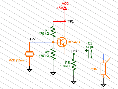 But below you can see a simple practical circuit of the emitter follower. With this circuit, a piezoceramic sound transducer (piezoceramic disc) can be used as a contact microphone to capture structure-borne sound waves. At the output you just need to plug a low impedance earphone to be able to listen to the mystic grumbles. Give it a try.