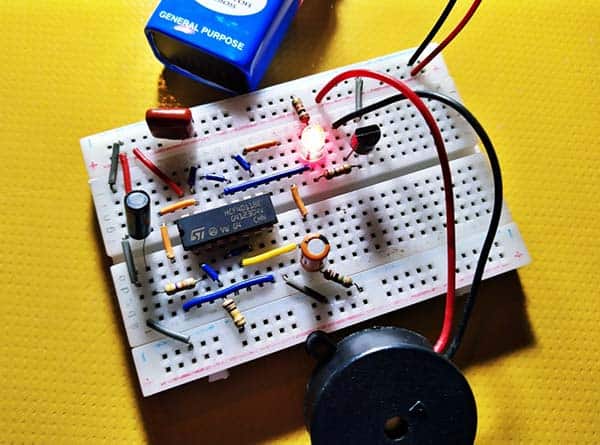 And then, I rigged up a small electronic circuitry to work as a ‘translator’ i.e. to help the Grove-water sensor to drive the COB LEDs as and when required. Below you can see its schematic centered on the ubiquitous 555 timer chip.