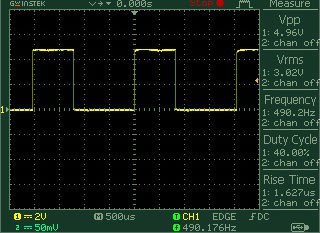 This is a random scope capture of the PWM output (generated by the above code) available through Arduino’s D9 pin. Here, the Vactrol can roughly ‘see’ a 0-50% duty cycle, 490Hz PWM drive signal at its input (LED). If you connect an Ohm meter across the output (LDR) of the Vactrol, you can assure that your ‘voltage-controlled resistor’ is in working order.
